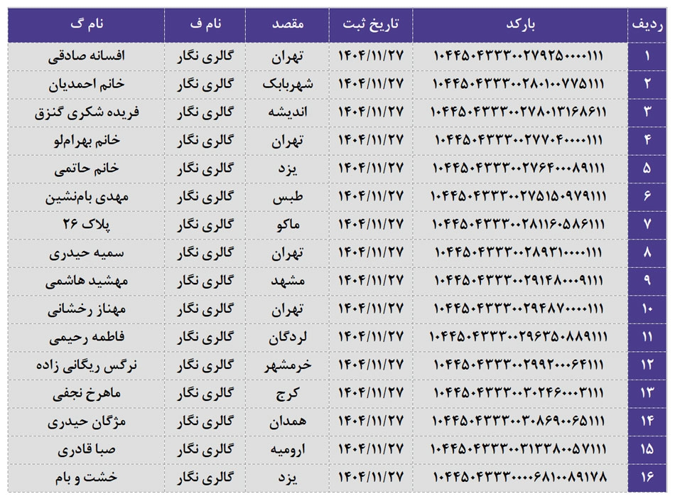 کدهای رهگیری 27 بهمن 1404